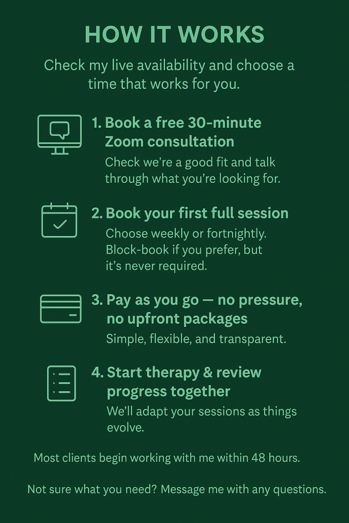 Your first session is a focused 50 minutes where we explore what’s going on for you, what you want to change, and what working together will look like. You’ll leave with clarity and a plan for the next steps.